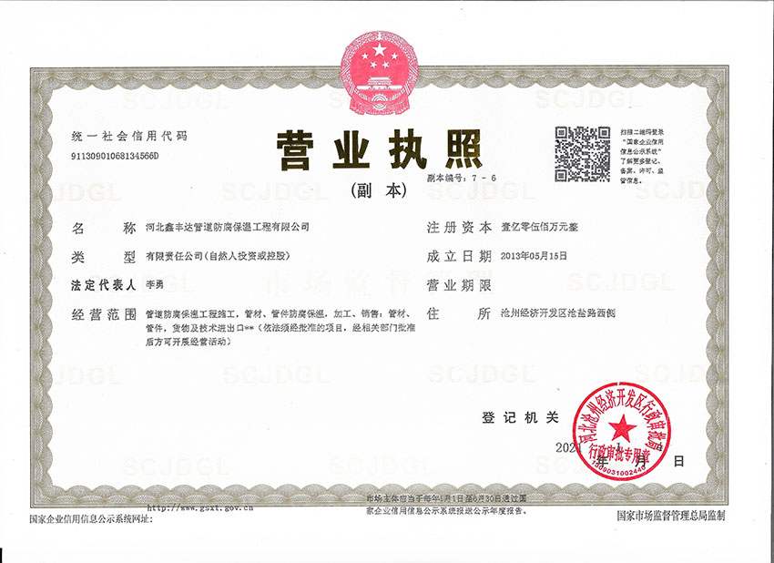 河北鑫豐達管道防腐保溫工程有限公司坐落于滄州市開發(fā)區(qū),通過ISO9000質(zhì)量管理體系認(rèn)證。本廠擁有工程師4名、技術(shù)人員30名,員工60人,注冊資金5500萬元。專門從事3pe/2pe防腐鋼管、保溫防腐鋼管、防腐螺旋鋼管、水泥砂漿防腐鋼管、等配套工程施工,以及防腐材料研發(fā)制造的大型專業(yè)化企業(yè)。是河北省防腐保溫行業(yè)協(xié)會理事單位。年生產(chǎn)能力500萬平方米。